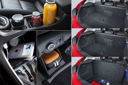 Справа фотографии багажника с системой FlexFloor и полкой, установленной на разных уровнях. Слева - отделения для мелочевки. Новые ниши на центральном тоннеле появились благодаря тому, что отсюда исчезла "кочерга" ручного тормоза. Вместо нее - клавиша.