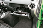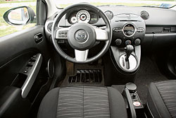 Если во внешности “двушки” фирменная “маздовская” диета совсем неочевидна, то в салоне сразу видно: вес здесь сгоняли с упорством фитнес-маньяка. Даже пластиковые дверные подлокотники сделаны настолько тонкими, что прогибаются, стоит нажать на них пальцем. Приборная панель – гимн минимализму. Здесь всего два циферблата: в центре и покрупнее – спидометр, тахометр значительно меньше и расположен левее. Предусмотрен еще и скромный ЖК-дисплей. В машинах без борткомпьютера на него выводится информация об остатке топлива. А, скажем, температура охлаждающей жидкости на совести контрольных ламп. Даже перчаточный ящик у “Мазды” не простой, а так сказать облегченный. Причем благодаря прорези в верхней части он скорее напоминает почтовый ящик. Прикольно.