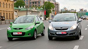 В штатных ситуациях и “Мазда”, и “Опель” без проблем получают зачет за ездовые повадки. Легкий руль, легкие педали, легкие маневры, чего же боле? Что, вам действительно интересно, как супермини ведут себя при интенсивном педалировании? Извольте…