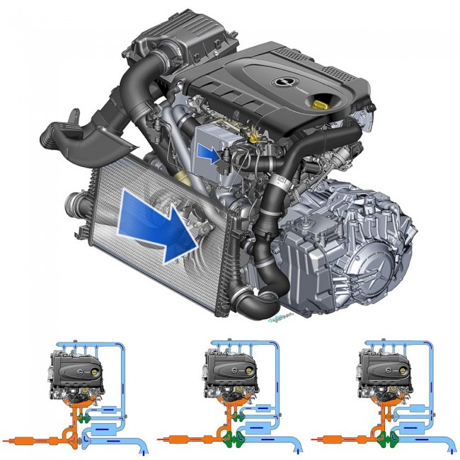 Говорят, работы над «заряженной» версией известного 1956-кубового мотора (он стоит, в том числе, и на Insignia) начались ещё в 2008 году, но из-за кризиса проект задвинули в долгий ящик. К счастью, Opel смог найти средства, «разморозить» и довести до логического завершения труды инженеров. В новом двигателе применена «последовательно-параллельная» схема двойного турбонаддува. До 1500 об/мин «дует» маленькая турбина, которая должна обеспечивать необходимую тягу на низах, затем к ней подключается большая «улитка» – вместе они нагнетают воздух до 3000 об/мин, после чего работает только основной турбокомпрессор.