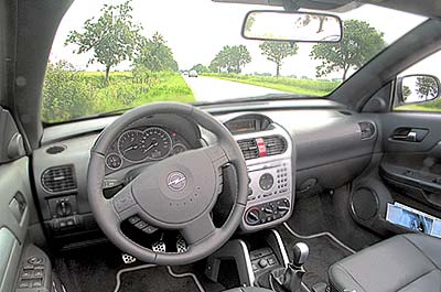Модерновые "трехмерные" фары прикрыты гладкими прозрачными обтекателями. Между ними, на декоративной алюминиевой накладке, как на орденской ленте, "висит" крупный опелевский логотип. Весь облик "Tigra" пышет стремительностью и силой. Дизайн способен ввести в заблуждение. Броскую двухместку, силуэт которой венчает такая "гоночная" деталь, как алюминиевые защитные дуги позади кресел, можно принять за спорткар. Однако характер автомобиля совсем иной. Это - отнюдь не "генератор адреналина". Это - родстер-купе для приятных прогулок.