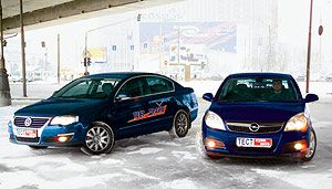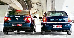 По паспорту 2,2-литровая 155-сильная «Вектра» уступает «Фольксвагену» 0,3 секунды при разгоне до сотни. Вот только светофорная дуэль раз за разом оставалась именно за «Опелем». И это несмотря даже на менее изысканный 5-ступенчатый «автомат». На шоссе «Вектра» также показалась более эластичной и приемистой.