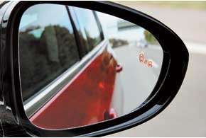 | В подлокотнике есть несколько отделений для мелочей и два подстаканника. | При появлении помехи в мертвой зоне в углу зеркала загорается желтый силуэт авто и звучит сигнал. После достижения скорости 150 км/ч он горит постоянно. |