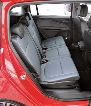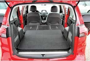 А что же сзади? Главное отличие новинки – модернизированная система трансформации салона Flex7 Plus. Если у обычной Zafira второй ряд – это цельный диван, складывающийся вплотную к передним креслам, то в Zafira Tourer – три полноценных раздельных сиденья, которые двигаются назад-вперед на 280 мм. При этом спинку каждого кресла можно зафиксировать в одном из четырех положений. Если же седоков во втором ряду лишь двое, то от центрального места можно отказаться. Наружные кресла сдвигаются ближе к центру за счет того, что в сложенном положении центральная подушка находится ниже наружных. Третий ряд подходит больше для детей, нежели для взрослых. Несмотря на удобные сиденья, места для ног и головы здесь недостаточно. Сиденья второго и третьего ряда, а также спинку переднего пассажирского кресла можно сложить, что позволит перевести предметы длиной более 3 м.