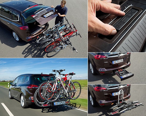 Фирменная «фишка» Опеля — встраиваемое в задний бампер крепление для велосипедов — нашла свое место и в новой Зафире. Раньше оно выдерживало 2 велосипеда по 30 кг каждый, теперь его можно (опционно) нарастить до 4 велосипедов (по 20 кг). И еще один плюс — велосипеды не надо снимать, чтобы открыть заднюю дверь, все крепление откидывается назад, давая доступ к багажу. Однако стоит помнить, что эта опция лишает машину запаски.