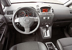 Кресло это, нужно сказать, просто классное. В меру жесткое, да еще с хорошей боковой поддержкой. Диапазоны регулировок широки: похоже, и баскетбольный центровой, и хрупкая балерина усядутся за рулем без проблем. Колонка, как и на первой “Зафире”, регулируется в двух направлениях. Сам руль – небольшого диаметра, с пухлым ободом, обшитый кожей – так и просится в руки. Как такому отказать?